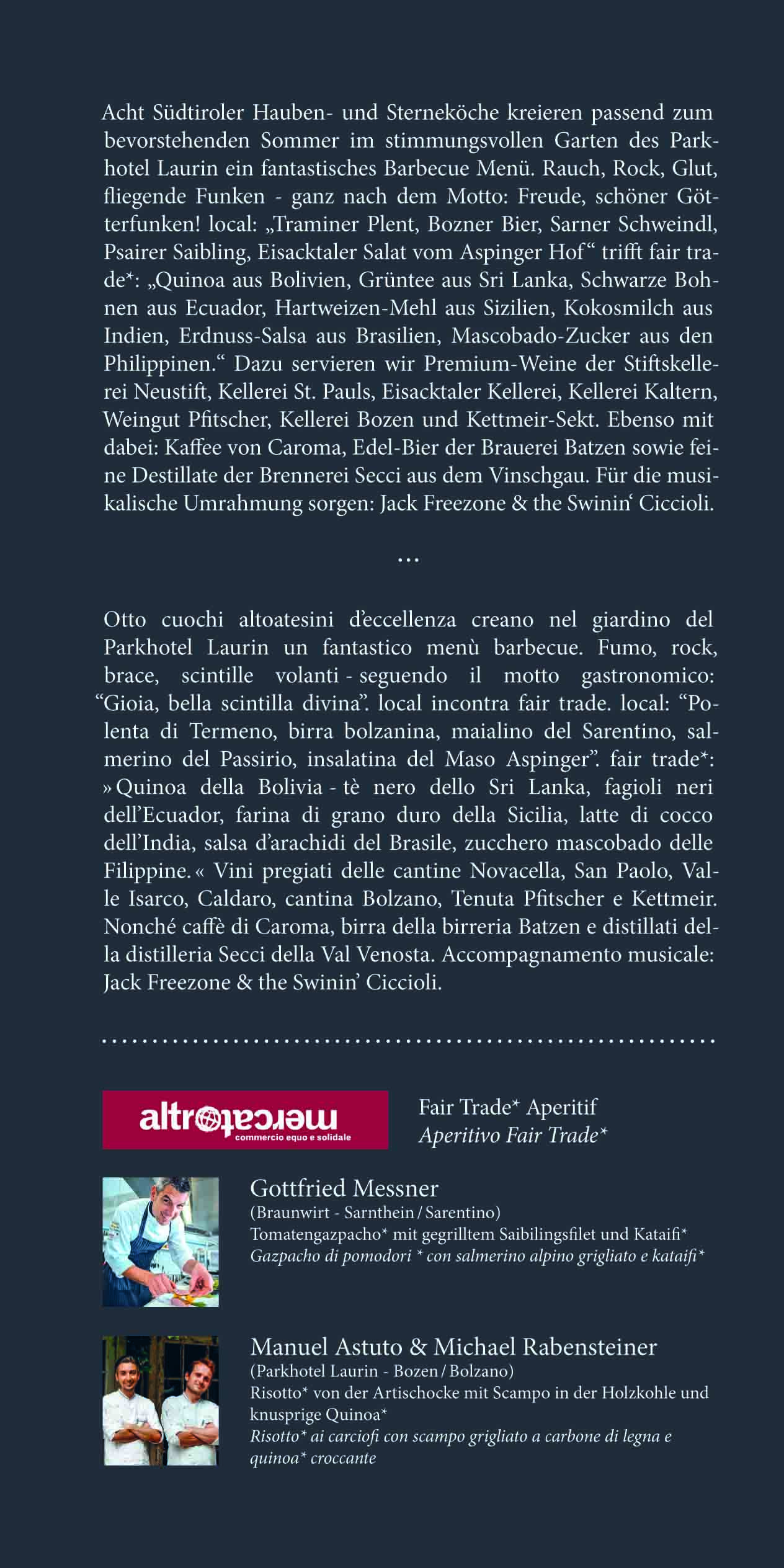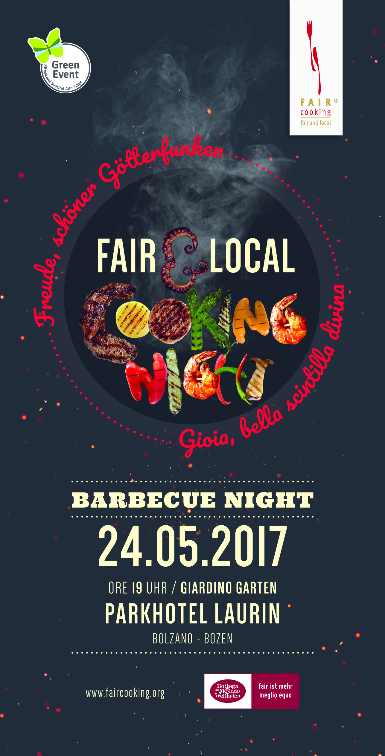 Finalmente: mercoledì, 24 maggio 2017 avrà luogo la prossima edizione della fair & local cooking night presso il giardino del Parkhotel Laurin a Bolzano. Godetevi una serata bellissima! Mangiare con gusto e degustare vini e birre eccellenti altoatesini e tutto all’insegna fair&local. Vi aspettiamo.